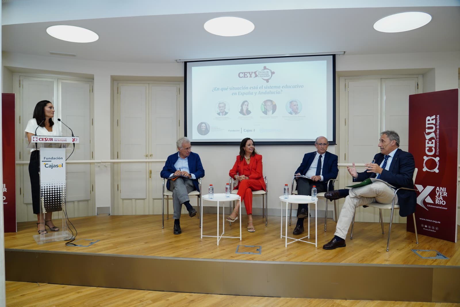 Tras la presentación del informe se ha realizado un coloquio en el que han participado Rocío Guerrero Durán, directora general del Centro Santa Joaquina de Vedruna de Sevilla; Rafael Caamaño Aramburu, presidente de CECE-Andalucía; y Manuel Jesús Sánchez Hermosilla, director general de Ordenación y evaluación educativa de la Junta de Andalucía, que nos dejó ideas clave: impulsar la autonomía de los centros, reforzar el papel del profesorado, simplificar procesos y evaluar con rigor las políticas educativas.