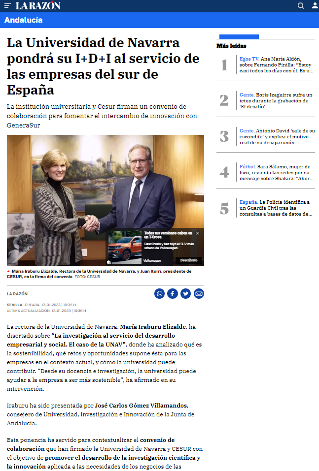 Repercusión La Universidad de Navarra pondrá su I+D+I al servicio de las empresas del sur de España